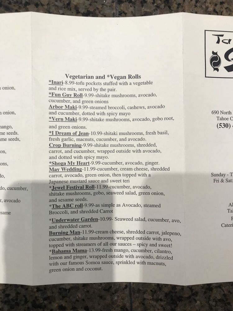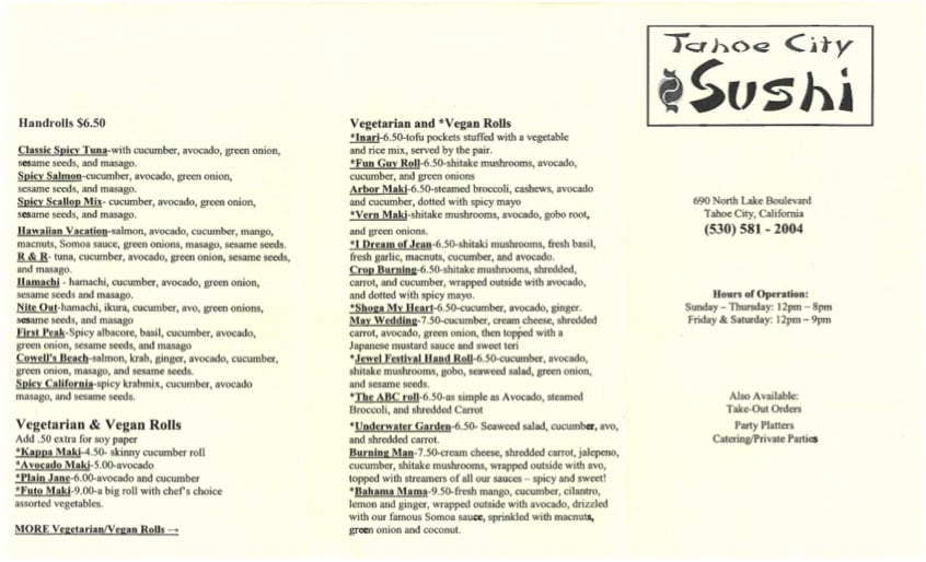 Introducing the menu at Tahoe City Sushi, a cozy sushi bar located in Tahoe City, CA. This restaurant offers a variety of sushi options, including vegan and vegetarian choices. The menu also features takeout, reservations, and catering services, making it a convenient choice for groups and families. Customers rave about the Placer gold roll and miso soup, highlighting the quality of the dishes and friendly staff. With outdoor seating and a casual ambiance, Tahoe City Sushi is a great spot for lunch or dinner. Don't miss out on their house hot sake and well-made sushi rolls with generous portions. Enjoy a view of the water from the patio and savor the flavors of their delicious sushi selections. Visit Tahoe City Sushi for a memorable dining experience.